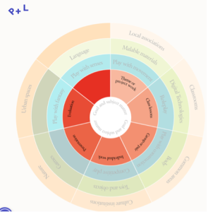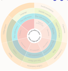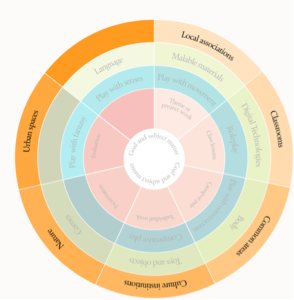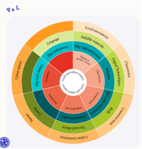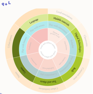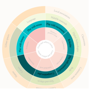 Try to spin the wheel and the five categories in a random way and then challenge yourself to plan a lesson with the outcome of the different categories. Try to reflect on the process as you go along with the planning. Remember to integrate the three playful learning principles Creating Shared Ideas, Daring the Unpredictable, Insisting on Meaningfulness